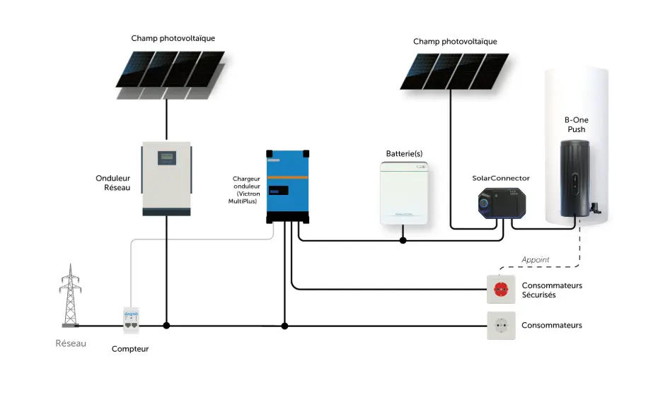 U hoeft uw omvormer niet te vervangen door een hybride omvormer, de acculader is al inbegrepen in het Wanit-systeem en wij installeren een omvormer/lader om uw elektrische circuits van stroom te voorzien.